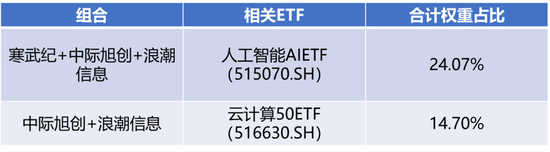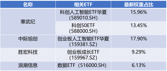 可以借道哪些ETF布局?我们通过万得等工具可以筛选出上述“算力巨头”含量较高的ETF:科创50ETF(588000.SH)科创人工智能ETF华夏(589010.SH)创业板人工智能ETF华夏(159381.SZ)创业板成长ETF(159967.SZ)数据ETF(516000.SH)以及云计算50ETF(516630.SH)等。对应个股权重占比如下图所示: