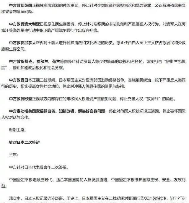这番系统性的批判,意义远超为中国一国辩护。它实际上是在为所有长期承受西方话语霸权的发展中国家发声。过去几十年来,人权的定义权、解释权、裁判权几乎被西方国家垄断,他们想打谁就打谁,想怎么定义就怎么定义。而这一次,中国通过系统性的解构和批判,狠狠地动摇了这个旧秩序的根基,让全世界看到,那个高高在上的“祖师爷”,自己家里也着着火。 就在现场七个国家和欧盟代表陷入集体沉默、场面一度十分尴尬的时候,一个不和谐的声音响起了——日本代表居然当场“还嘴”反驳。 这一举动,仿佛是给即将熄灭的火堆里又添了一把干柴,瞬间点燃了更激烈的交锋,也催生了中方最顶级、最具穿透力的一轮反击。