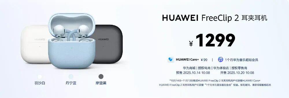 定价方面,HUAWEI FreeClip 2 耳夹耳机首发价格1299元。2025年10月14日10:08开启预售,10月20日10:08正式开售。