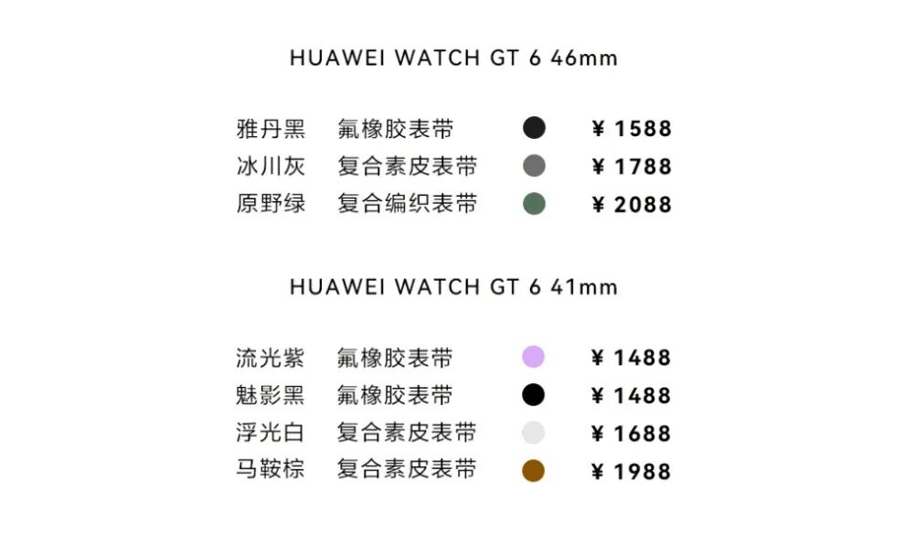 HUAWEI WATCH GT 6 46mm 1588元起,HUAWEI WATCH GT 6 41mm 1488元起,现已开启预售,9月29日正式开售。