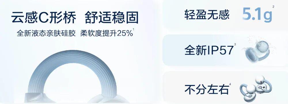 云感C形桥采用全新亲肤液态硅胶材质与高弹性记忆金属,全新升级的舒适豆更轻盈小巧,单耳机重量5.1g,推出丹宁蓝、羽沙白与摩登黑三款配色。